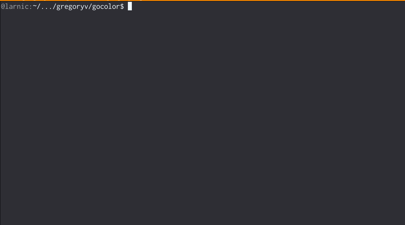 §2 Features §2.1 Default This tool was initially developed to color go test output for easy scanning of pass-, skip- and failed tests. By default those prefixes will be colored in a fixed set of colors. §2.2 Custom For any other coloring you can supply custom colors on the command line $ echo "hello my friend" | gocolor "hello:red" "friend:green;blink;dim" §2.3 Configured From v0.9.0 you can configure a set of default coloring expressions in either local .gocolor or $HOME/.gocolor file; one expression on each line, e.g. error:red warning:cyan info:green panic:bgred;white;blink